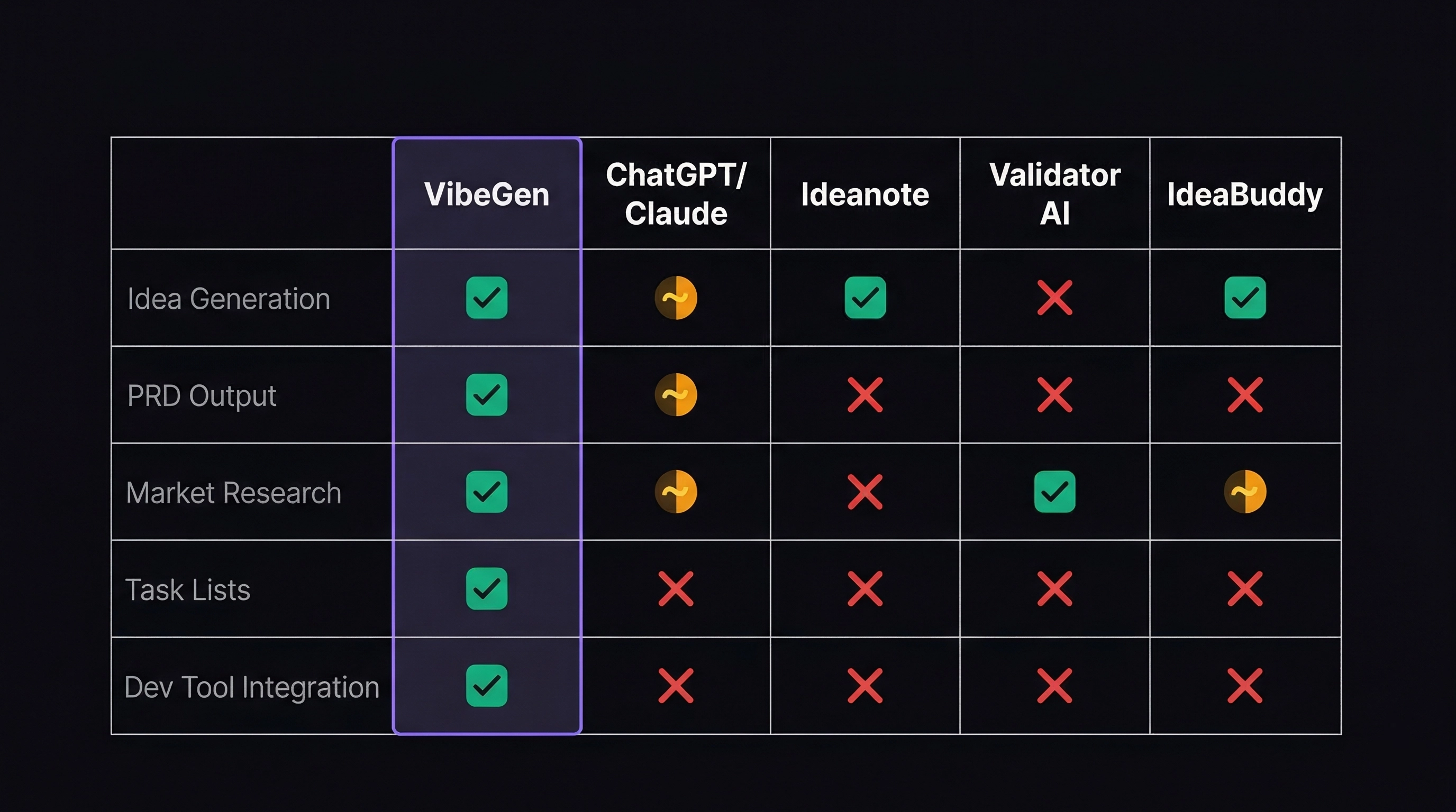 | VibeGen | Scored & ranked | Full PRD with schemas | Competitor + trend data | Ordered by dependency | Free tier / from €12/mo |