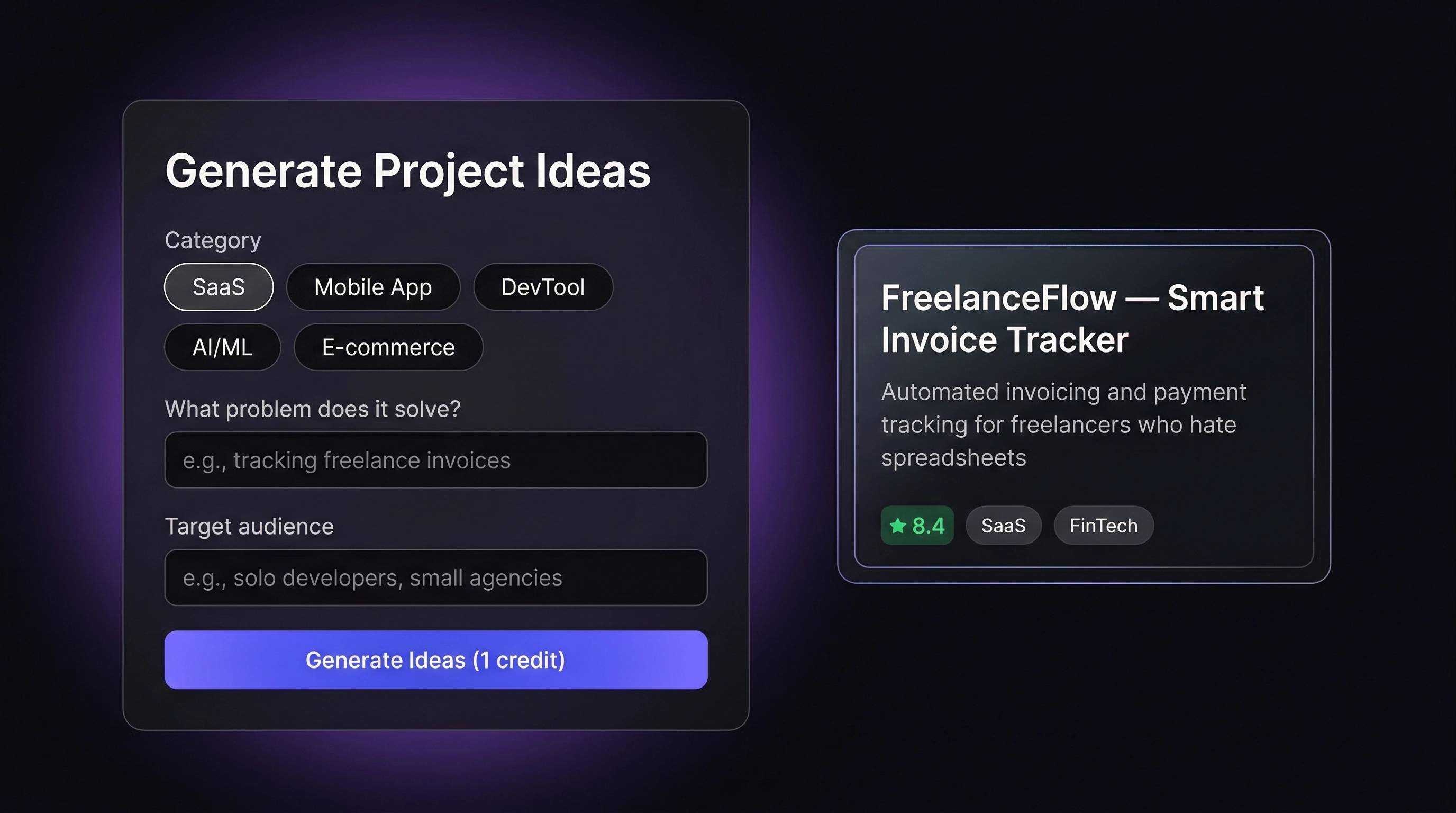How it works: You describe your skills, interests, and target audience through a guided wizard. The AI generates scored project ideas with market analysis. But here's where it gets interesting — you can then expand any idea into: